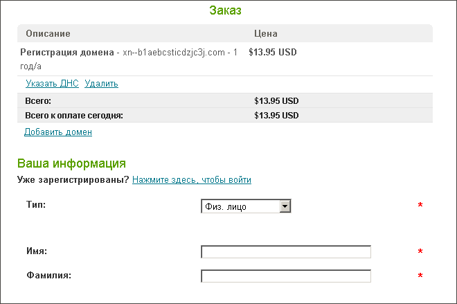 Для заказа кириллических доменов (IDN-доменов) перейдите на страницу "Цены и заказ доменов".