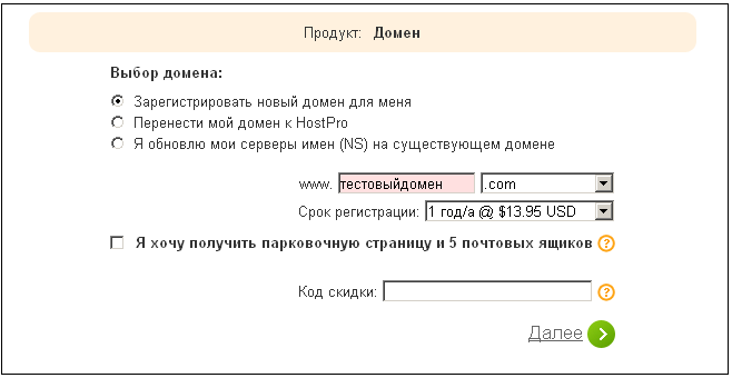 Введите желаемое имя домена в поле "www.". Нажмите кнопку "Далее".